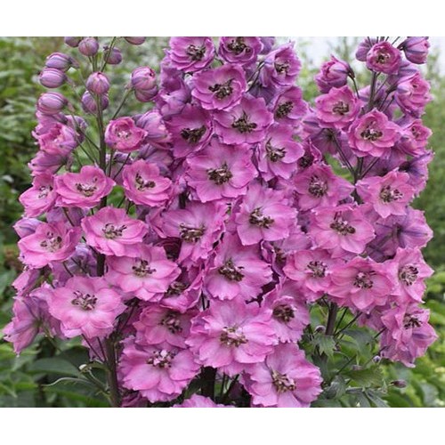 Delphinium Pacific Giant Astolat is a perennial variety that is early to flower and grows to a height of 1.8m. It produces Lilac Rose Flowers with a White Bee. Attractive to Bees. Ideal for Borders.